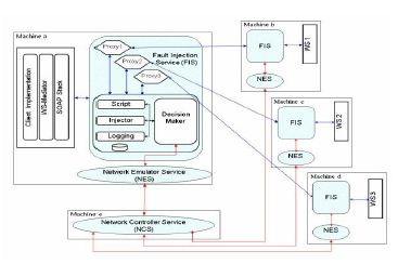 The fault injection method is designed to overcome the shortcomings of earlier fault-injection tools. It minimizes the dependence on the underlying OS and distributed computing platform.Although the implemented version of our testing method is for SOAP based composed service systems, the architecture is generally applicable to be deployed to any SOA distributed computing platform (e.g. Open Grid Services Architecture) that allows the installation of proxies into the communication subsystem. The emulator is transparent to the applications and requires no modifications, recompiling or patching. NetFIS is also independent of any hosting environment for portability. Finally, NetFIS gives the applications under test the sense that there are other -synthetic- applications running during the test and sharing the networking resources without a perceivable emulation overhead. Our NetFIS Architecture tool consists of three main components as follows: