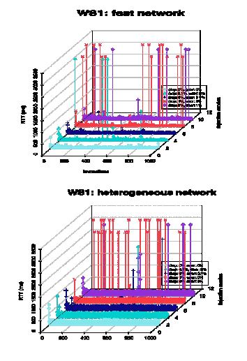 The overall average RTT of the fast network is much smaller than of the other two network conditions. The Figure clearly shows greater RTT variations of the heterogeneous network than the slow network. The timeout value has been regulated to 3000ms in the Figure to make the plots more readable.