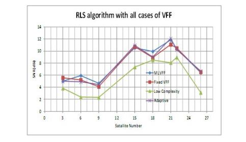 Results were obtained for the signal to noise ratio of select satellites to show the improvements made by using the statistical decision theory based variable forgetting factor, λ, for a certain interferer level. Figure 2 Shows a summary and comparison of the results of the four cases of (RLS) algorithm based on variable forgetting factor λ (fixed, adaptive, low complexity, ML). The value of λ must be in range. In this paper the value of λ being used is 1 for the fixed VFF case. The results are shown in terms of the S/N ratio vs. satellite Space Vehicle Numbers (SVNs) 3, 6, 9, 15, 18, 21, 22, and 26. The reason these satellites were selected is their signal levels represent a detected signal based on some threshold. This threshold is determined by the statistics of the residaul noise variance. While three of these cases show close results, the (low complexity VFF) has the definite inferiority. Table I, shows another summary. This time is in terms of the average of the S/N for each case.