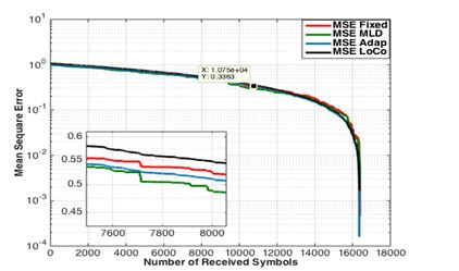 By estimating the initial value of and the adaptive algorithm begins its work with the training mode, then it switches to the decision directed mode by implementing by using equations (24) – (27) [5].