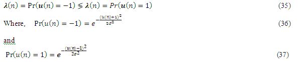Since λ tracks the statistical variations of the received data. The probability is based on the noise variance and how far the received data from their nominal values (1 or -1 for 0). Then, λ(n) would take on the highest probability for which the probability of the received data is the highest since λ represnets a weight. The probability follows the conditional Gaussian probability density function in which we estimate the probability of a symbol was received given the other symbol was sent. This depends on the power of the interference, in other words, it depends on the interference variance, . Since the GPS modulation is (BPSK), we ultimately need to decide the noise free GPS data sent was a “1” or a “-1” for a “0.” Then,