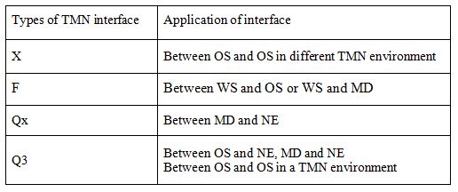 In TMN, there are four different communication interfaces which are shown in table 3. As shown in table 3, Q3 interface includes different connections in TMN environment. Although Q3 interface uses to interact between different system functions but type of interchanged management information is different. The applications of Q3 interface in TMN are listed in front of Q3 in the table 3 which are between OS and NE, MD and NE, OS and OS in a TMN environment.