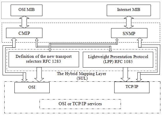 As explained in subsection 3.3, each of the CMIP and SNMP might implement on the OSI and TCP/UDP/IP models separately. In the proposed architecture, the main advantage is the possibility of network management of both OSI model and TCP/UDP/IP networks simultaneously. As shown in figure 8, this new architecture could manage hybrid OSI and Internet-based networks [21]. We named this new architecture SUL (Sub-layer between Upper and Lower layers). This model means: