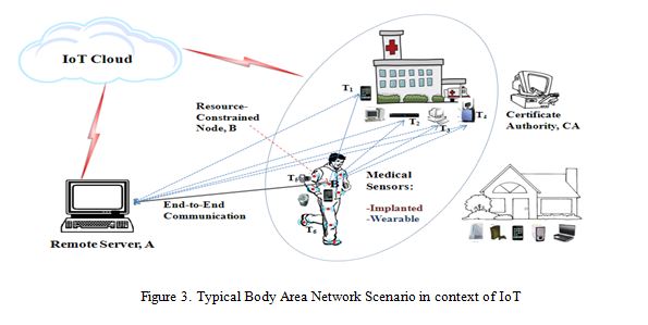With IPv6 there are enough IP addresses to connect billions of ‘things’ to form our new IoT world but whether these things would be secured enough to ensure individual privacy rights and secure the systems from malicious attacks? The cryptographic algorithms are required to be highly efficient, low power, low energy realizations especially for battery operated or passively powered devices. In many practical applications, the gateway needs to send periodic control messages, notifications, and sensitive confidential data to all the wearable devices where a common secret key is required to encrypt the broadcast messages. Symmetric key cryptography such as AES provides fast and lightweight encryption/decryption on such smart devices and their integrated hardware supports it as well. However, when this number of connected devices becomes high, exchanging symmetric keys becomes infeasible and the need to have an efficient scalable key establishment protocol becomes critical. Another approach is to distribute keys by asymmetric key cryptography but it requires high computational costs; the main concern for resource-constrained devices [16]. Therefore, conventional security primitives cannot be applied due to the heterogeneous nature of sensors (either implanted, on-body or wearable), low resources and the system architecture of IoT based healthcare systems [3].