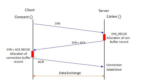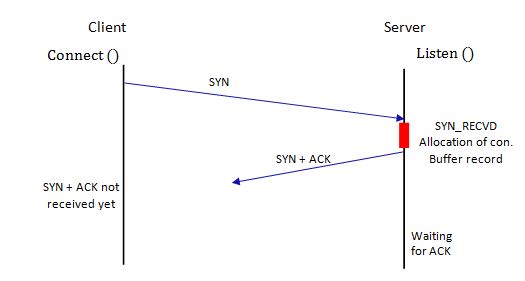 The promising situation for the exploit lies in the allocation of the server’s resources (during initial connection setup). When the server obliges to the clients request by allocating connection buffer space and send back a SYN-ACK, the connection at this point is said to be half open. The allocated resources by the server are kept occupied for the client-request until an ACK is received from the client, the