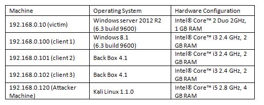 The experiment was carried out under controlled conditions on a Local Area Network consisting of a server, 3 client computers and an attacker. The configuration of the machines are presented in Table 1. The server is the victim machine which is at the receiving end of the traffic generated by the attacker machine. There are 3 legitimate clients as well who want to access the services of the server machine. The server is running on VMware Player V7 [33], hosted on a Windows 8.1 machine (6.3 build 9600) with Intel® Core™ i5 2.8 GHz, 4 GB RAM.