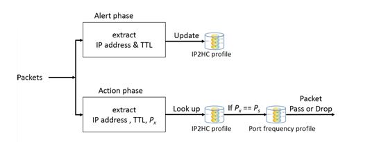 traverses through a router; if the value reaches 0, the packet is dropped by the router. Hop count is calculated by subtracting the currently received TTL value of the IP packet, from the initial TTL of the IP packet, which is set by the Operating System. These initial TTL values are OS dependent and vary from OS to OS. Potential initial values of TTL across various operating systems (variants of Linux and Microsoft Windows) are 30, 32, 60, 64, 128, and 255 [20]. Given the relatively limited hop counts of 1-30 [28] between any two hosts on the internet it’s not that hard to guess the initial TTL value. After inferring the initial TTL value, hop-count is calculated by subtracting the final TTL value from the initial TTL value. After this the IP address of the packet is searched in the IP2HC table for the stored hop count of the packet. If there is a mismatch, the packet is deemed as spoofed, otherwise the packet is put forward for further processing. The destination port number is extracted from the packet now and is searched and compared to the port numbers in the port-frequency-monitoring table. If there is a match, the packet is dropped. If there is no match the packet is a legitimate one and is granted entry. The algorithm is as follows:
