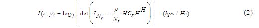 In the above model, ρ is the average signal to noise ratio and y represents the received vector of size Nr ×1 and s represents the transmitted vector of size Nt×1. The MIMO channel is represented by the H matrix of size Nr × Nt , whereas the noise is represented by the vector n of size Nr×1. The mutual information between the transmitted signal and the received signal, I(s; y) when the channel matrix H is deterministic and is known to the receiver which is given as: