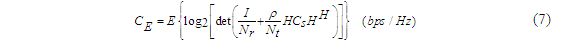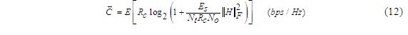 The erotic channel capacity in (7) is valid for channel matrix where different signals are transmitted independently and hence cannot be applied directly to the space time block coding where the signals are transmitted form of spatial block codes. In fact, an STBC scheme with Nt transmit with Nt transmit antennas and Nr receive antennas is generally characterized by the transmission matrix which has the general form [9, 10]: