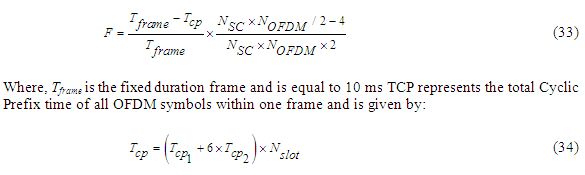 Finally, Tsub is the duration of one sub frame and is equal to 1 ms. To take into account the losses due to the added cyclic prefix and reference symbols, a correction factor F is introduced in system capacity and is given by: