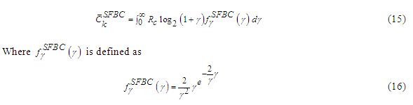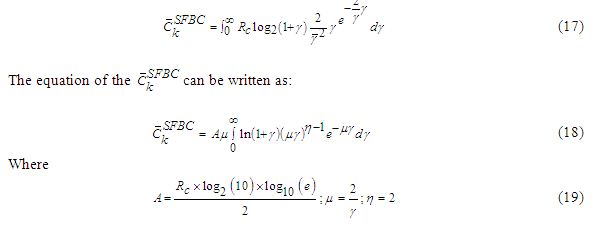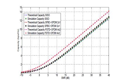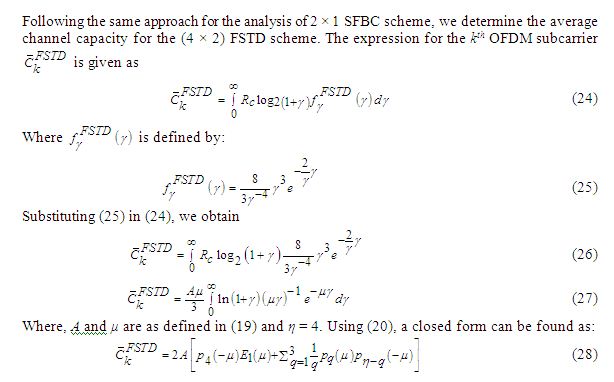 Where, k represents the subcarrier index and χ ϵ{SFBC, FSTD}. The average capacity achieved by a SFBC-OFDM scheme is calculated using the probability density function of the instantaneous SNR: