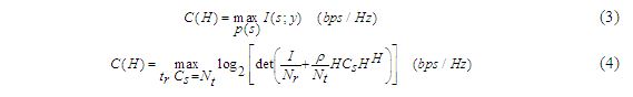 As is the covariance matrix of transmitted signal vector s and I is the identity matrix with dimension Nr.ρ is the average signal to noise ratio. By definition, the channel capacity is the maximum of the mutual information where the maximization is taken over all possible covariance matrix Cs and hence the deterministic MIMO channel capacity can be written as: