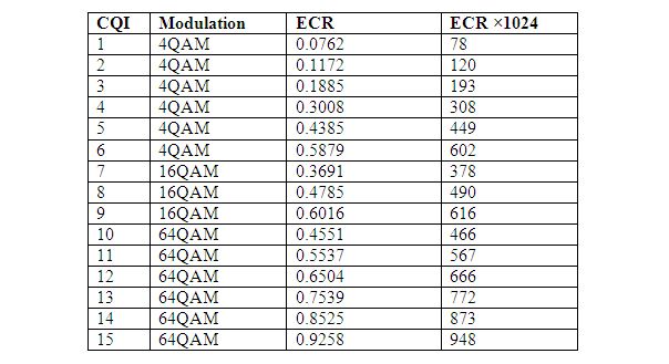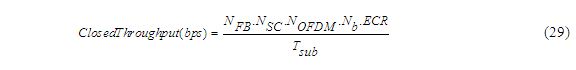 where NFB is the number of Frequency Blocks in the given frequency bandwidth (B), NSC is the number of subcarriers in one Frequency Block, NOFDM is the number of OFDM symbols in one sub frame, Nb is the number of bits in one subcarrier; ECR is the Effective Code Rate, and Tsub is the duration of one sub frame that is equal to 1 ms. In LTE, NSC and NOFDM are fixed with values 12 and 14 respectively [4]. For 5 MHz (NFB = 25) bandwidth LTE system with 64-QAM Modulation (Nb = 6) and ECR = 0.9, the maximal data throughput that can be supported by the system is then 22.68 Mbps. The un coded data throughput can be found by excluding the effective coderate (ECR) from the equation (29).