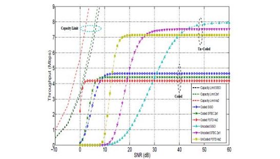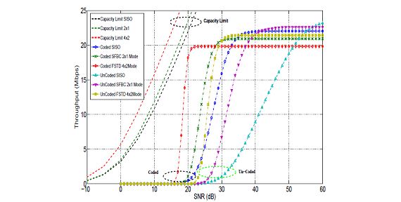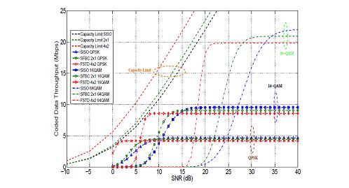 The effectiveness of the FSTD scheme is clearly observed in Figure 6 where the maximum data throughput is achieved with 23 dB compared to 32 dB with 2×1 SFBC and 41 dB with SISO. The theoretical channel capacity limit is also shown in the Figure. To compare the coded data throughput with the theoretical limit of channel capacity, the coded data throughput of all modulation schemes and diversity schemes are made in Figure 7, where the coded data throughput for QPSK, 16-QAM, and 64-QAM and for SFBC and FSTD MIMO schemes are plotted.