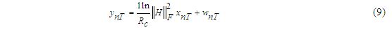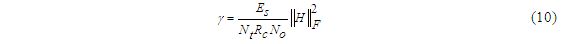 Where, and is the S × 1 complex matrix after STBC decoding and S represents the number of transmitted symbols. And is the transmitted S ×1 complex vector with each entry having energy Es/Nt, Es is the maximum total transmitted energy on the Nt transmit antennas per symbol time, and wnT is complex Gaussian noise with zero mean and variance N0/2 in each dimension. is the squared Fresenius norm of H, hij is the channel gain from the ith transmit antenna to the jth receive antenna. Rc is the code rate of the STBC and defined as S/T, where T is the number of time slots to transmit one block code. From the equivalent AWGN channel in (9), it is shown that the effective instantaneous SNR at the receiver denoted as γ is given as: