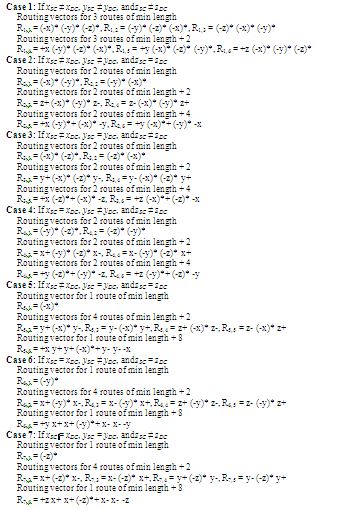 The notations: –y, +y, y-, y+, (-y)*, (-y)*+, –z, +z, z-, z+, (-z)*, and (-z)*+ are defined similarly for the other two dimensions Y and Z. Depending on the relative positions of the source cell SC and the destination cell DC, 6 cell-disjoint paths from SC to DC each of minimum or near minimum length are constructed as described by the routing vectors in figure 2.The 7 cases of figure 2 cover all the cases of relative positions of the source cell SC and the destination cell DC. The cell-disjoint property of these routes is based on the results of [24] (see Theorem 2, Theorem 3 and Theorem 4 of [24]). When sending a packet from a source node to a destination node, one of the cell-disjoint paths between the source cell SC and the destination cell DC is followed using one of the routing vectors of figure 2. The routing vectors are stored at each node. At each hop, the next move indicated by the routing vector is followed until the packet reaches the destination cell. At any given time, packets originating at a source node S are routed towards a destination node D along one of the 6 cell-disjoint paths that exist between S and D corresponding to the 6 routing vectors listed in figure 2.