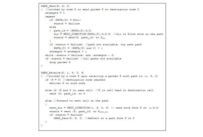 When a node H receives a packet P containing the path identifier (i, S, D), it calls the function GARP_Receive(P, i, S, D, H) which forwards the packet to the cell head at the neighbouring cell corresponding to the next move on the specified path (i, S, D). This step is repeated until the packet is received by the cell head of the destination cell which delivers it to the destination node D. At each hop the function call Next_Direction(i, S, D, H) determines the direction (x+, x-, y+, y-, z+ or z–) of the next cell based on the corresponding routing vector. If the forwarding of a packet by a node H fails, then node H deflects the packet by sending it along one of the 6 paths from H to D instead of continuing on the ith path (i, S, D) from S to D.