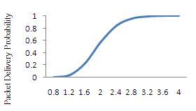 Figure 4 plots Pdelivery versus the network density d = N/kmn. The network density is the average number of sensor nodes per grid cell. We observe a fast increase in the packet delivery probability as the network density d = N/kmn increases. The packet delivery probability approaches 1 when the network density reaches a minimum (an average of 3 nodes per grid cell in this experiment).With small density (sparse network), it is possible that some of the grid cells do not host any sensor nodes and therefore the paths that go through these (empty) cells cannot be used for routing packets resulting in a lower packet delivery probability. As the number of nodes increases, the probability that all the cells crossed by any path are non-empty increases and hence the packet delivery probability also increases and approaches 1 when a minimum in the average number of nodes per cell is reached.