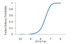 A similar fast increase of the packet delivery probability is observed in figure 5 where the number of sensor nodes is kept fixed but the grid dimensions (k, m, and n) are gradually decreased. We assumed in this experiment that k = m = n for simplicity. We conclude from this experiment that using smaller grid dimensions (k, m, and n) for a given underwater geographical area with a given number of sensor nodes is better (for higher packet delivery probability) than using larger grid dimensions. In other words, it is preferable to view the geographical area as a smaller number of big cells than as a larger number of small cells but of course, the cell size is limited by the transmission range since nodes in neighbouring grid cells must be able to communicate directly in GARP. With a smaller number of big cells, the routing paths are shorter (in terms of the number of hops) and hence the probability of successfully relaying a packet at each hop of its routing path is higher.