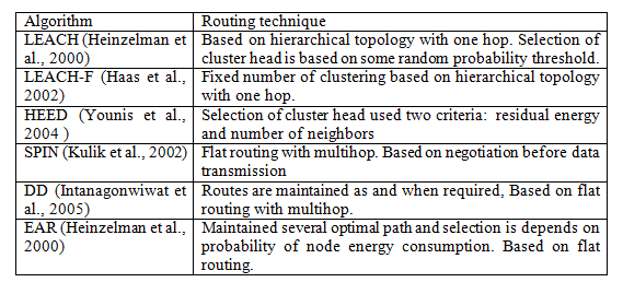 Routing protocols based on network structure is divided into two categories: flat routing and hierarchical routing. In a flat routing, all nodes are at same level whereas in hierarchical routing they have different level. We have reviewed some flat routing protocols Sensor Protocols for Information via Negotiation (SPIN) (Kulik et al., 2002), Directed Diffusion (DD) (Intanagonwiwat et al., 2005) and Energy-Aware Routing (EAR) etc. The typical hierarchical routing protocols in WSNs include Low-energy Adaptive Clustering Hierarchy (LEACH) (Heinzelman et al., 2000), Hybrid Energy-Efficient Distributed clustering (HEED) (Younis et al., 2004 ), Distributed Weight-based Energy-efficient Hierarchical Clustering protocol (DWEHC).