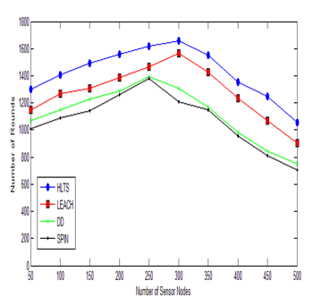 Fig. 3 shows the comparisons between numbers of nodes vs. number of rounds. Increase in the network lifetime as number of nodes is increases. As number of nodes increases, more cover set generated. Thus excessive messaging is generated among the nodes. When number of nodes reached around 250-300 all protocols network lifetime (number of rounds) decreases. HLTS drops its number of rounds to 1100 when number of nodes reached 500. LEACH drops its number of rounds to 950 when number of nodes reached 500. DD drops its number of rounds to 850 when number of nodes reached 500. SPIN drops its number of rounds to 800 when number of nodes reached 500. Hence HLTS has 15-20% higher network lifetime as compared to these protocols.
