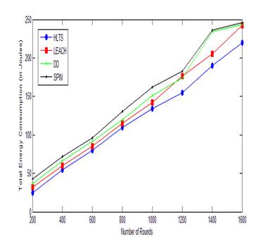 Fig. 4 shows the graph comparing the number of rounds vs. total energy consumption among SPIN, DD, LEACH and HLTS. In the proposed algorithm HLTS the total energy consumption is 95 Joules around at rounds 600, whereas SPIN protocol consumed 150 Joules, DD consumed 120 Joules and LEACH consumed 107 Joules. HLTS reduces energy consumption since only activated nodes in the network are involved in network and rest of nodes remains in standby mode.