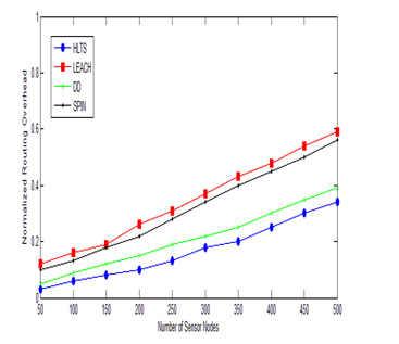 Routing overhead can be define as a ratio of total number of bytes sent in overhead as compared to the total number of bytes sent in data transmission successful. It is normalized to measure between 0 to 1. Figure 6 shows number of nodes vs. normalized routing overhead. When number of nodes around 100 in the network, the routing overhead is less for all protocols. As number of nodes increases routing overhead also increases. When number of nodes 500, SPIN protocols has 70% normalized routing overhead i.e. 70% extra bytes sent as compared payload. At the same scene HLTS has 38%, DD has 62% and LEACH has 45% normalized routing overhead.