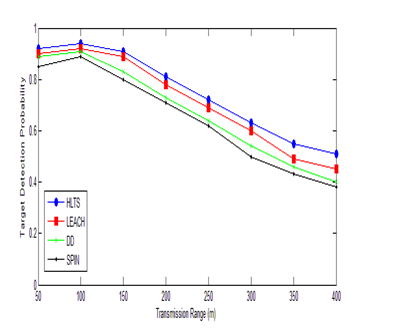 Fig. 7 shows the transmission range vs. probability of target detection. When a target is sensed by a sensor, a three dimension array is used to store the location of target. Xk store the target state at k step. Target state is toggle between 0 and 1. When state is fixed i.e. either target is in or out from the trajectory. This is to minimizing false alarms. Up to transmission range 150m, all protocols have almost 90% target detection probability. As transmission range increases the target detection probability sharply decreases.