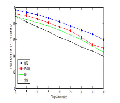 Figure 9 shows the target speed vs. probability of target detection with 100m transmission range and number of nodes 100. When target are static the probability of target detection is almost 90% for all four protocols. As the target speed increases the target detection probability decreases. SPIN and DD has 40% of target detection probability due to lots of multiple path generated due to crossing of target to various nodes. HLTS also suffer with the same problem but it store sensed information at node, parent node and grandparent node only. Thus it performance degrade slowly to 60% at target speed 40m/sec.