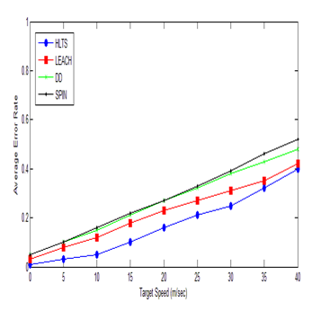 Error rate are measure against the target speed in fig.e 10. As the target speed increases the error rate also increases for all the algorithms. When target are less mobile the error rate i.e. target not detected or wrongly detected or misplaced is 5% but when speed of target is 50 km/hour the error rate increase to 30%. At target speed 20m/s, average error rate for HLTS is only 5%, LEACH 8%, DD 10% and SPIN 18%. But as speed increased to 35m/s, average error rate for HLTS is only 10%, LEACH 30%, DD 33% and SPIN 45%. SPIN suffer badly due to excessive traffic implosion as target move with high speed.