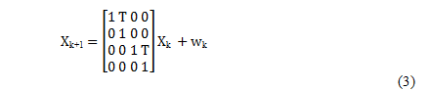 where Xk is the target state at the kth time stamp, Fk is the state transition matrix, and wk ∼ N(0, Qk) is the noise factor support Gaussian distribution and Qk is variance (Chen et al., 2011).