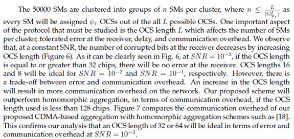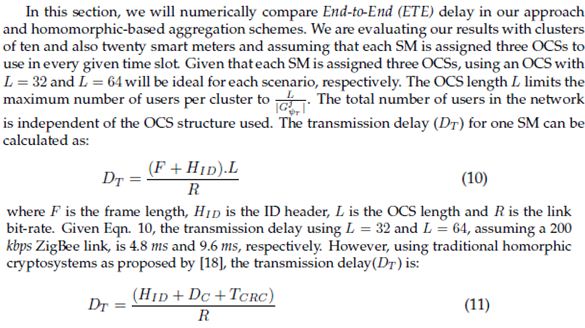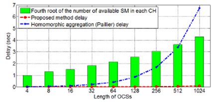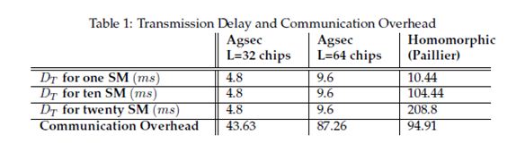 5.1 Comparative Performance Evaluation By Numerical Analysis As discussed in Section 2.1, existing secure aggregation schemes impose a significant communication and computation overhead on SGNs with limited capabilities. Private aggregationschemes based on the homomorphic properties of cryptosystems require fixed large size input blocks and are not ideally suited for small-sized data generated by SMs.The 20 to 30 bit [3] output data generated by SMs has to be padded, e.g.,to 2048 bits for Paillier [42], before encryption. In our approach, by choosing OCSs with appropriate length,this overhead can be significantly reduced. Readers should note that in our scheme each bit will be spread to L bits after encoding.