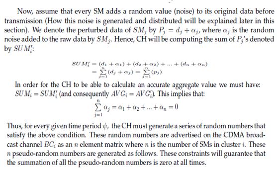 noise perturbation technique. Instead of aggregating the original smart meter data and sending the aggregate value to the UC, every smart meter utilizes a pseudo-random noise to perturb its data before aggregation. This perturbed data (instead of the original data) will be sent for aggregation to the CH. The received perturbed values Pi will be aggregated at the CH given the aggregation function in Section 4.4. Perturbation techniques in the literature usually follow two approaches. The basic idea of one group of such approaches is to add noise to the actual data such that the aggregator, or the CH in our case, can calculate an accurate aggregate value without inferring individual data transmitted by every node [54]. In a second similar direction, the data can be manipulated such that the aggregator can calculate an aggregate value which is an estimate of the histogram of data distribution rather than the actual aggregate value of the original data [61].