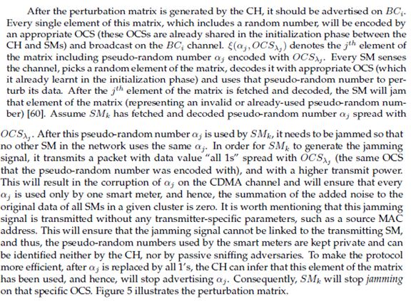meter are randomly selected by the CH from a large pool of available OCSs. Each smart meter will use the OCSs uniquely assigned to it in the time frame ψT . In order to spread data bits on the AS data channel, the smart meter calculates the inner-product of every data-bit in appropriate OCS. Every single bit of data is coded independently with an OCS different from the previous and next data bit. This will build the foundation of our secure scheme as described in Section 4.4. It should be noted that it is possible for multiple smart meters to use the same OCS for data transmission in different parts of the network as long as their transmission ranges do not overlap and the SMs are in two diffrent clusters. This is required to make sure that the transmissions do not interfere with each other (in general, interference is anything that alters, modifies or disrupts a signal as it travels between a source and a receiver). The same CDMA concepts and principles are also deployed on the BCi channel. This broadcast channel is used by the CH to advertise perturbation data to the SMs, as discussed in Section 4.2.