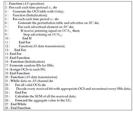 In protocol 4, the UC receives the aggregated data from the CH on the UA channel.Protocol 5 elaborates how CH generates and distributes OCSs (for aggregation and perturbation)to the SMs. Also, it shows how the data is despread, aggregated, and forwarded to the UC by CH. Finally, protocol 6 elaborates how SM receives the initialization information,perturbs data and transmits to the CH on the AS channel.