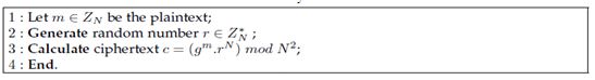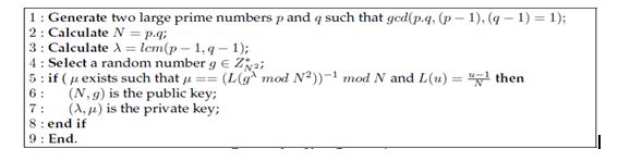 In general, data aggregation techniques might support different aggregation functions such as sum, max, min, avg, median, and variance. However in SGNs, the UC is mostly interested in total consumption (sum) of a given neighborhood in a specific time period to enable functions such as demand-response, load-shaping, peak-shaving, and self-monitoring [4, 3, 15, 17]. Also, the average (avg) usage of each household might be of interest. Given that sum of consumed electricity of all smart meters in a residential neighborhood is required to be computed in a private fashion, the additive homomorphic property of the Paillier [42] cryptosystm can be useful. Also, the Boneh-Goh-Nissim cryptosystem [47, 26] (which is an extension of Paillier with bilinear groups) supports the additive homomorphic function. Rather than adding the consumption data in plaintext, one can multiply the encrypted values and then decrypt the result to get the addition of plaintext data. The Paillier encryption system works as explained in Protocol 1 (Key Generation), 2 (Encryption), and 3 (Decryption) [18]. As it can be observed, the sum of plaintext can be computed from multiplication of the ciphertext, i.e. D(E(m1):E(m2) mod N2) = (m1 + m2)mod N or D(C1:C2 mod N2) = (m1 + m2)mod N, where N is the modulus for encryption and decryption.