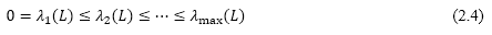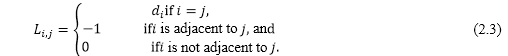 if i is adjacent to j, and eq. (2.3) if i is not adjacent to j, where di denotes the degree of i-th node. The Eigen values of L are also derived by the same way of Adjacency matrix, using eq.(2.2). So, we have m(1 ≤ m ≤ n) different values for L as follows.![]()