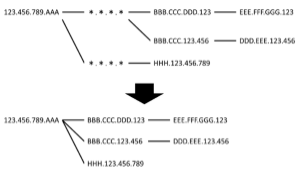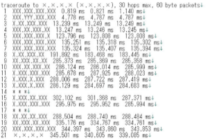 However, the results of trace route command do not always show all IP address on the route. Figure 2 shows an example the of result of trace route command (note that symbol “X” denotes some numbers). In this figure, in line 14-th and 17-th, the symbol “* * *” denotes no answer from the server or the router on the path. In this case, unfortunately, we cannot know its IP address. First, we make a temporary topology map holding these unknown IP address. Then we delete these unknown IP addresses from temporary topology map, and we derive resultant topology map such as Figure 3. We define such resultant topology map as the malicious topology map. Actually, there is an open project to estimate the detailed Internet topology map such as CAIDA [3]. However, our purpose does not follow their service policy. So, note that we derive a topology map by our own method. If we can get cooperation with the organization such as CAIDA, it is obvious that we can get precise malicious topology map easily.