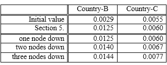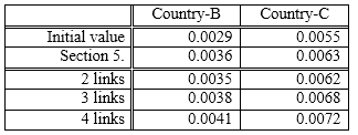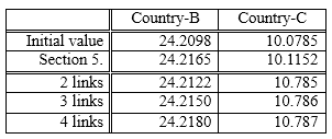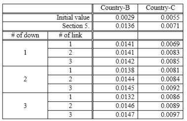 The results are shown in Table 9.The result of section 5 selects 5.5300×103 and 3.9134×105 for Country-B and 4.9643×106 and 2.4272×107 for Country-C. In this way, by connecting a node with a small accessibility and a large node, the value of R can be greatly improved. On the other hand, in the combination of small accessibility nodes, not much improvement can be expected without three or more linking. However, since the linking of the two nodes is also improved over the initial value, we can judge that the effectiveness of Tactics-2 for Scenario-2 is high.