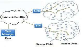 The WSN is a network of interconnected sensor nodes. Sensor nodes are designed compactly and low cost. The nodes are responsible for sensing ambient conditions such as temperature, sound, vibration, humidity, pressure, etc. Sensor nodes send their sensed data to the aggregation node and transmit data to Sink (transceiver). As shown in Figure 1, Sink is transmitted over the internet or satellite to the user. In this process, we see that the CH (Cluster Head) not only listen to the signals from the nodes not also synthesize data, then transmit data on Sink so that more energy is consumed, so the routing, specifying the path of this data stream is very important.