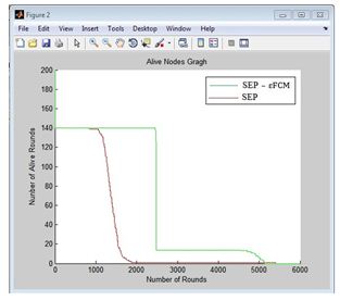 Therefore, the living nodes in the SEP_ εFCM combination protocol have more live nodes than the SEP protocol. After a few initial rounds are unstable, but then the number of live nodes starts to increase, this proves that the SEP_ εFCM combination protocol consumes more efficientenergy than the SEP protocol. Results for the SEP_ εFCM combination protocol have improved more live nodes than the SEP protocol.