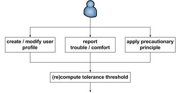 Inform the user of the risks and propose a questionnaire to evaluate precisely his sensitivity level and create the user profile (first use). This sensitivity level, which allows computing the tolerance threshold, can be adjusted by adding objective data resulting from the measurements that will be made to provide this service appropriately. The tolerance threshold can also be adjusted following the person’s request. Indeed, as soon as the sensitive person feels bad, he / she can report that via the EWER service’s interface. This will result in a new computation of the tolerance threshold. Otherwise, if the sensitive person wants the precautionary principle to be applied, then the tolerance threshold takes a minimum value (Figure 3).