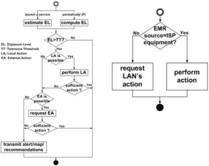 This function allows the EWER service to perform actions in order to reduce the exposure index of a sensitive person. This can be done before or after exceeding the tolerance threshold. When launching a new application / service that could generate radio communications in the sensitive person’s location, the EWER service will compute / estimate the person’s new exposure index and act if this last could exceed the tolerance threshold. Moreover, the EWER service will measure / compute regularly (period P) the user’s exposure level in order to act when this rate actually exceeds the tolerance threshold. Depending on the network environment of the sensible user, the network’s action (user’s network / external network) can be « impossible » or « possible ». The action is called « impossible » when no action can be performed by the network to reduce the exposure index. In this case, the action plan consists in alerting the user about the tolerance threshold exceeding and transmitting a map of the surrounding electromagnetic waves and some recommendations in order to minimise his exposure level by himself. For example, the sensitive person should move to another location. The action is called « possible », if the network can actually act in order to reduce the exposure index of the sensitive person.