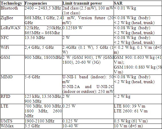 Table 1. Technologies, frequencies and SARs [13].