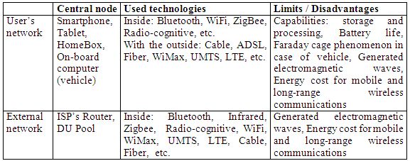 – User’s network: It is the network of the user. It may be composed of one or more small networks. These networks are generally interconnected with each other, and each of them is dedicated to specific applications or services. For example, a network of heterogeneous sensors equipping the user (e.g. WBSN: Wireless Body Sensor Network) or its environment (e.g. WSN: Wireless Sensor Network). To provide the user with a service, this network collects, stores and processes data. Thus, the intelligence required to implement the service is distributed on all network nodes. These nodes need to communicate with each other or with the outside. That’s why an access point is often essential to provide the user with the needed services. Depending on the configuration of the user’s network (nodes, architecture, etc.), the access point can be a smartphone (case of a WBSN equipping a mobile patient), a box (case of a home network) or an OBU (case of a VANET: Vehicular Ad-hoc NETwork).