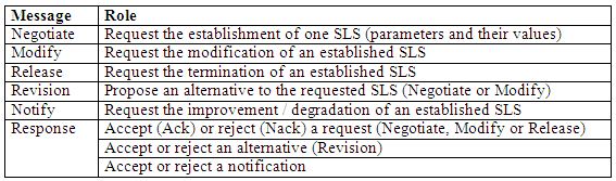 The SLNP protocol is used to negotiate SLS (Service Level Specification: SLA technical parameters) for ISP’s clients [15]. These negotiations may involve the different AS (Autonomous Systems) implied in data transport. To perform this negotiation, the SLNP protocol uses the six messages summarised in Table 4.