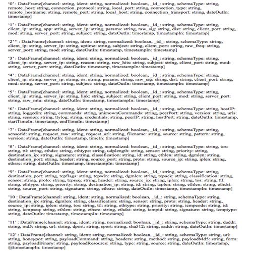 In Figure 5, we illustrate the new-created dataframes schemas which correspond to the different schemas of the payload attribute in Figure 4. By following this approach, data are easier to be handled: in the next stages, they will be cleaned, transformed from categorical to numerical and then they will be further analyzed in order to detect anomalies in entities behavior.