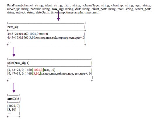 The dataframe schema in Figure 6 is the second of the dataframes derived by flattening the payload attribute (Figure 5) into its inner-level attributes. Here, feature raw_sig is in the form of an array. By applying consecutive transformations automatically, we manage to extract all inner attributes, which simplifies the process of correlating data in the next stage. Thus, by looking into the raw_sig column, we identify inner values separated by ‘:’, which further are decomposed into new features derived by the inner levels, as it is depicted e.g. for column attsCol5; the latter could be further split by leading to two new columns (e.g. with values 1024 and 0, respectively), as this process is recursive and automated; special care is given how we name the new columns, in order to follow the different paths of attributes decomposition.