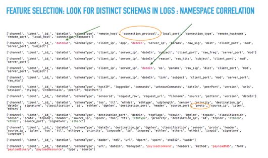Experiments with data received from different network monitoring tools regarding the system of a telco enterprise, at the exploratory data stage revealed that the number of single feature attributes in this log were between a range of 7 (the smallest number of attributes of a distinct feature space) up to 99 attributes (corresponding to the total number of the overall available feature space). A fact, that led us to carry on with feature extraction by focusing on flattening multi-nested records separately for each different structure (under a number of 13 different baseline structures).