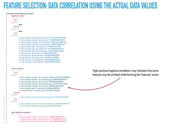 As long as data inputs, in the form of dataframes, are cleaned, transformed, indexed and scaled into their corresponding numerical values, and before the process of forming the actual feature vectors that will be used in clustering, by using data correlation, we are able to achieve a further reduction of the dimensions that will be used for the actual security analytics.